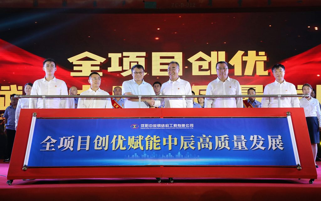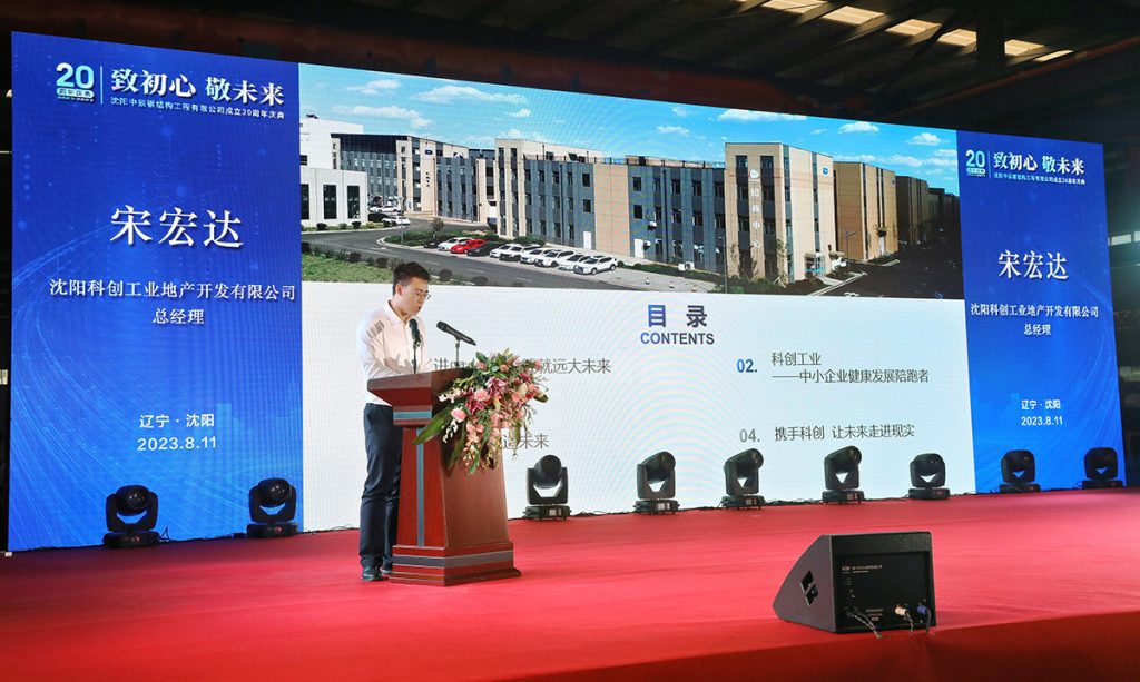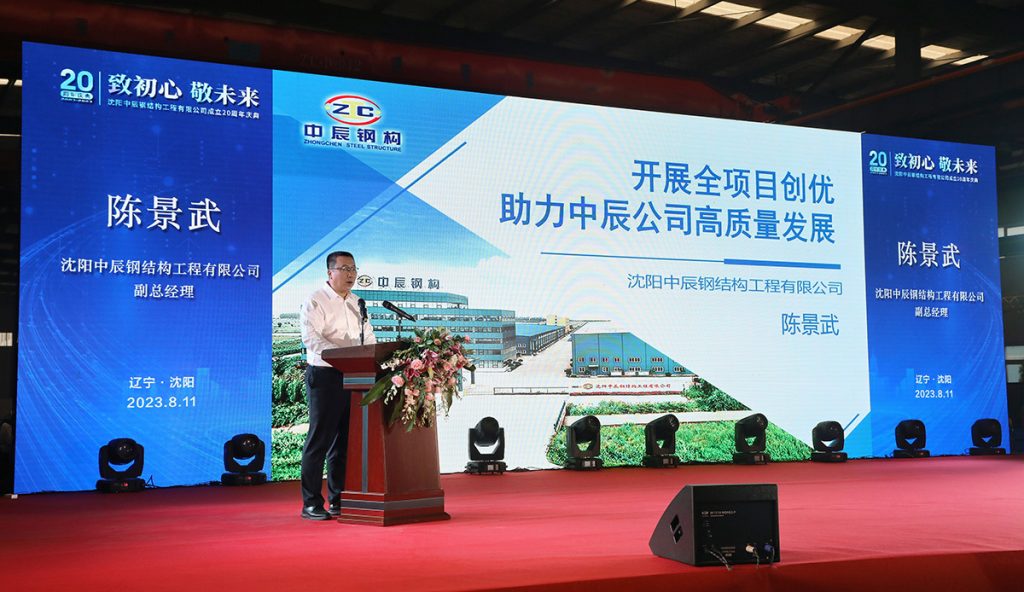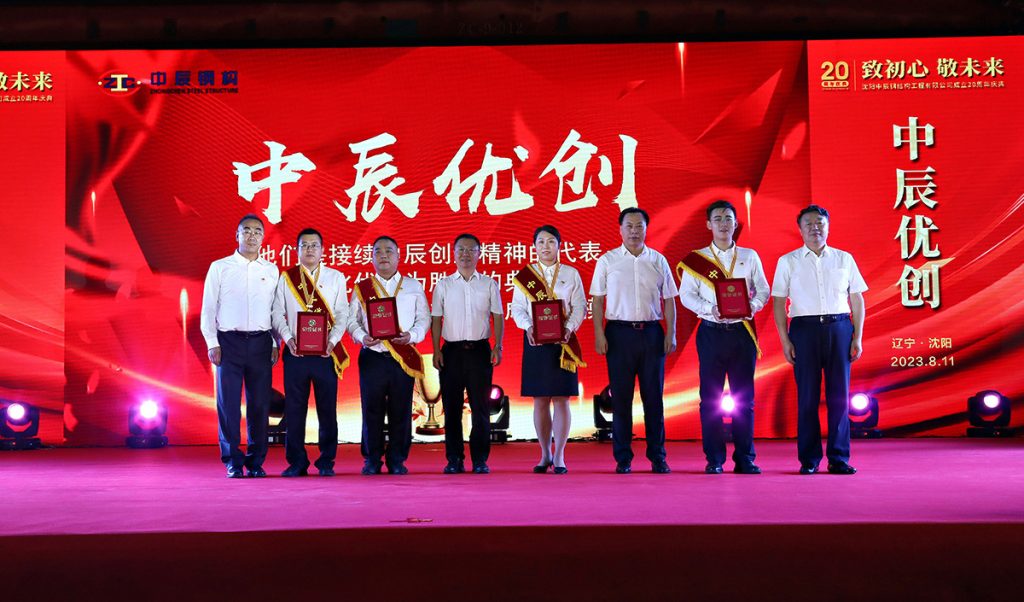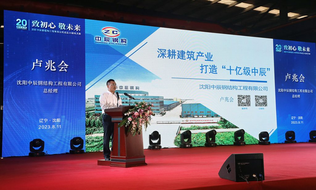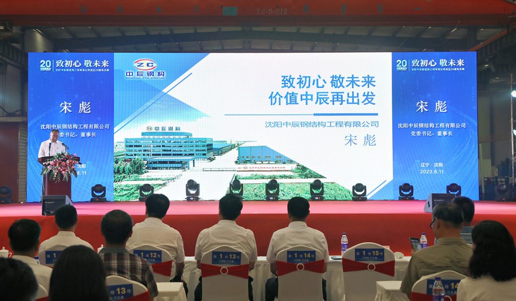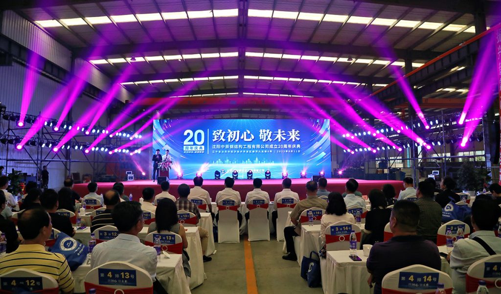 2023年8月11日,中辰鋼構“致初心 敬未來”成立二十周年慶典活動在中辰鋼構2號廠房隆重召開。遼寧省人大環境資源城鄉建設委員會副主任委員董峰、沈陽市鐵西區委副書記,區政府黨組書記、區長,經開區、中德園黨工委副書記、管委會主任趙永圣等省市領導出席會議和表彰,300余名合作伙伴與300余名中辰員工共同慶賀中辰鋼構成立二十周年。